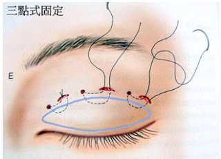 縫三個點,就像繪圖軟體要畫出平滑曲線一般,透過三個點作出雙眼皮的流暢弧度,可說是正統日式訂書針縫雙眼皮的標準方法,也是結構相對穩固的縫法。優點是縫線不易鬆脫,雙眼皮折痕維持較久;但相對的,因為縫了三針,術後組織反應較明顯,相對腫脹與瘀青的機率也會稍微提高,屬於「先苦後甘型」的雙眼皮。