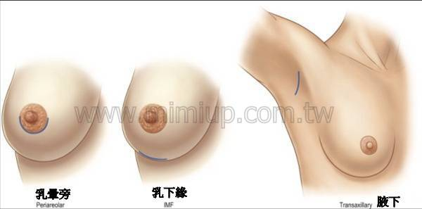 - 乳暈旁切口: 適合台灣女性,傷口隱藏在乳暈邊緣,復原美觀佳且避開乳腺。