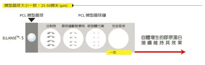 洢蓮絲中的PCL微粒子可持續刺激自體組織新生,讓新生的自體組織取代原本CMC凝膠體被人體分解後的空間,讓肌膚光滑年輕,豐盈有彈性。